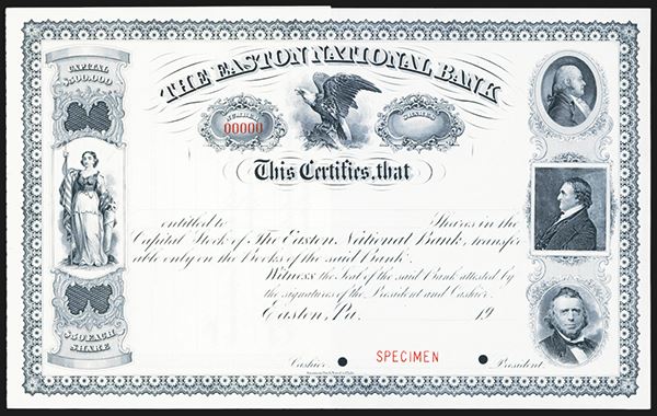 Easton, Pennsylvania. 19xx. Odd Shares, Specimen stock Certificate, Eagle in middle, three portraits at right, Standing Liberty on left, XF, ABNC.