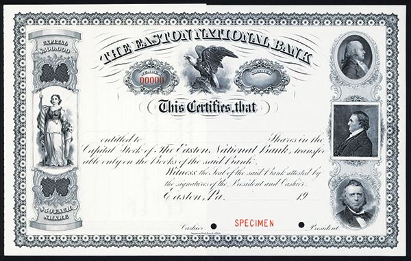 Easton, Pennsylvania. 19xx. Odd Shares, Specimen stock Certificate, Eagle in middle, three portraits at right, Standing Liberty on left, XF, ABNC.