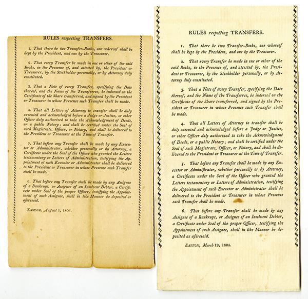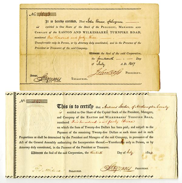 Pennsylvania, Lot of 2 stock certificates, both from the same company, Includes 1804, 1 Share and 1807, 1 Share, Both in Fine to VF. Scarce early turnpike stocks.