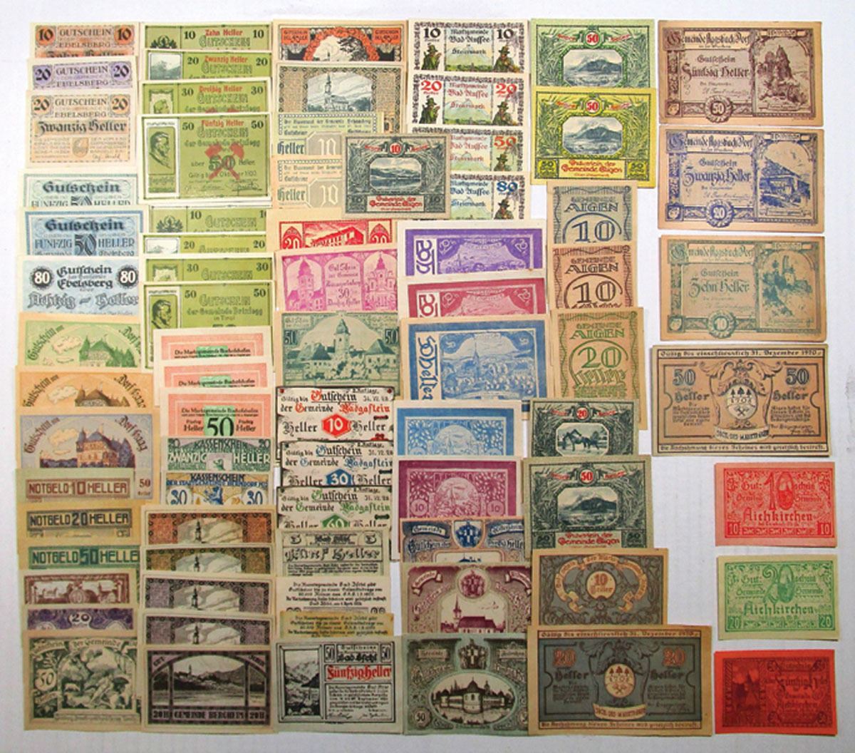 Austria, 1920. Lot of 70+ Colorful and attractive Notgeld notes with minimal duplication and mostly smaller sizes from various Austrian Cities. Notes ranges from XF to CU condition. (70+) Sold "AS IS" no returns accepted.