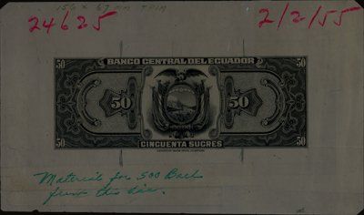 1955. P-Unlisted. 50 Sucres Photo proof of banknote back directly on thin metal plate. This design is not listed in Pick and is probably an essay. Scarce note and unique in this form. XF. ABNC.