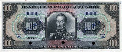 1956-1975. P-101A; 104A; 109. 10; 100 Sucres 3 different specimens with black "00000" serial numbers and red or black specimen overprints. All are unlisted as specimens. P-109 has small staple holes that barely break paper on top left border area that are hard to see, otherwise the note would be Unc.; P-101A is Unc and 104A would be Unc. but has small 1 inch tape stain on top margin. ABNC.