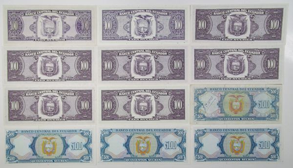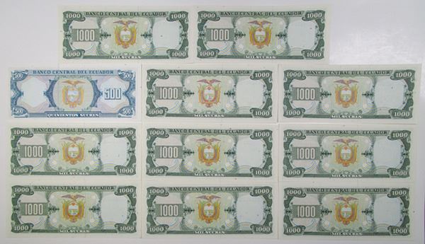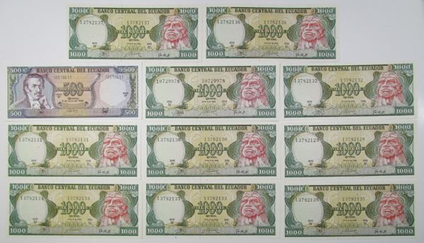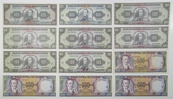 EcuadorÉ.. 1980s. Lot of 23 issued banknotes, Includes: 100 Sucres group of 8; 500 Sucres group of 5; and 1000 Sucres group of 10. All in AU to Uncirculated condition. (23 notes).