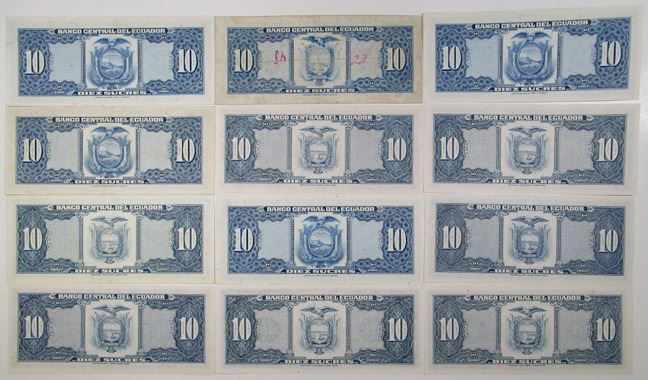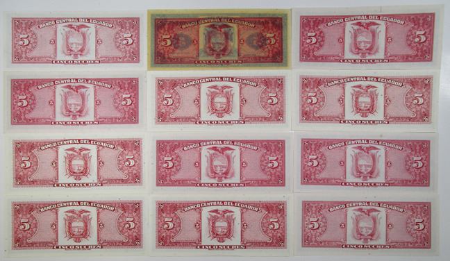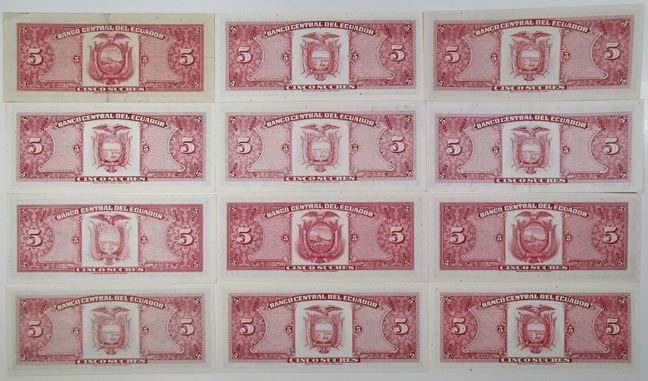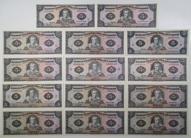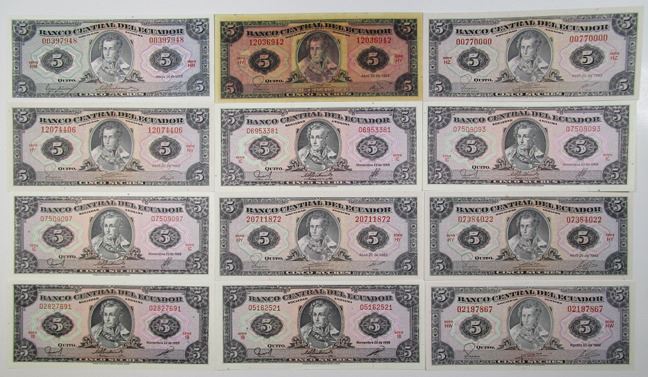 Ecuador. 1960-1980s. Lot of 60 issued banknotes: 5 Sucres group of 38 notes; 10 Sucres group of 22, All in AU to Uncirculated condition, Includes ABN and TDLR issues.