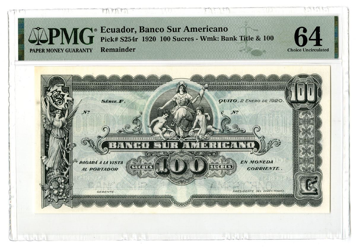 Ecuador, 1920. 100 Sucres, P-S254r, Remainder Banknote, Black on blue underprint with woman standing on cornucopia and holding up scroll at left and woman with two children at center, Back is black and blue with crown welcoming returning ships at center, No S/N, PMG graded Choice Uncirculated 64.