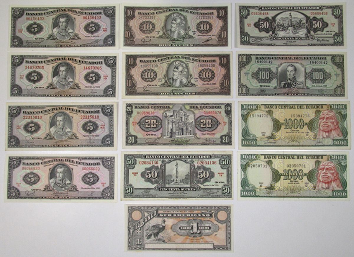 Ecuador, 1920-1988. Lot of 10+ Issued Banknotes, Includes: Banco Sur Americano 1 Sucre, P-S251r; Banco Central del Ecuador 50 Sucres, P-104b; 5 Sucres, P-108 (3); 10 Sucres, P-114b; 20 Sucres, P-115b; 5 Sucres, P-120A; 10 Sucres, P-121; 50 Sucres, P-122a; 100 Sucres, P-123Aa; 1000 Sucres, 125 (2). Notes range from XF to AU condition. (13). Sold "AS IS" no returns accepted.