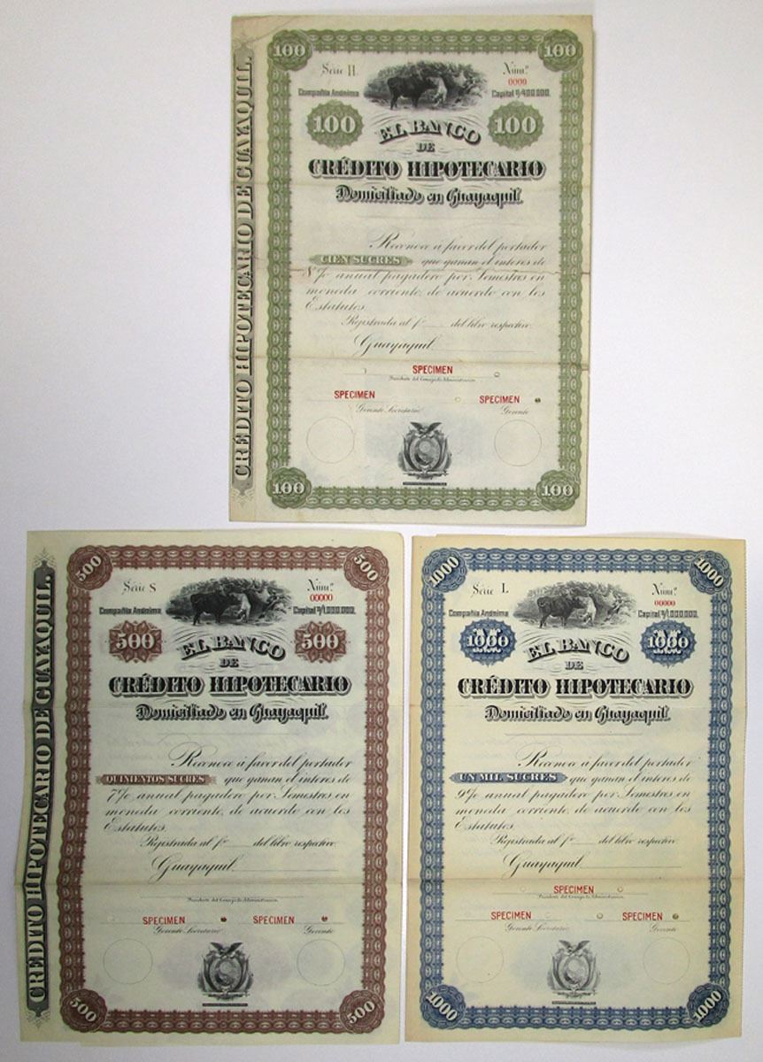 Guayaquil, Ecuador, ND (1880 to1920s) Lot of 3 Specimen Bonds, Includes: 100 Sucres 8% Serie H Coupon Bond, Black with olive green border; 500 Sucres 7% Serie S Coupon Bond, Black with brown border; 1000 Sucres 7% Serie L Coupon Bond, Black with blue border. All three bonds have cows at top and arms of Ecuador at bottom, Specimen overprints, POCs, and are in Fine with archival reinforcement at folds, to VF condition. ABNC. (3). Sold "AS IS" no returns accepted.