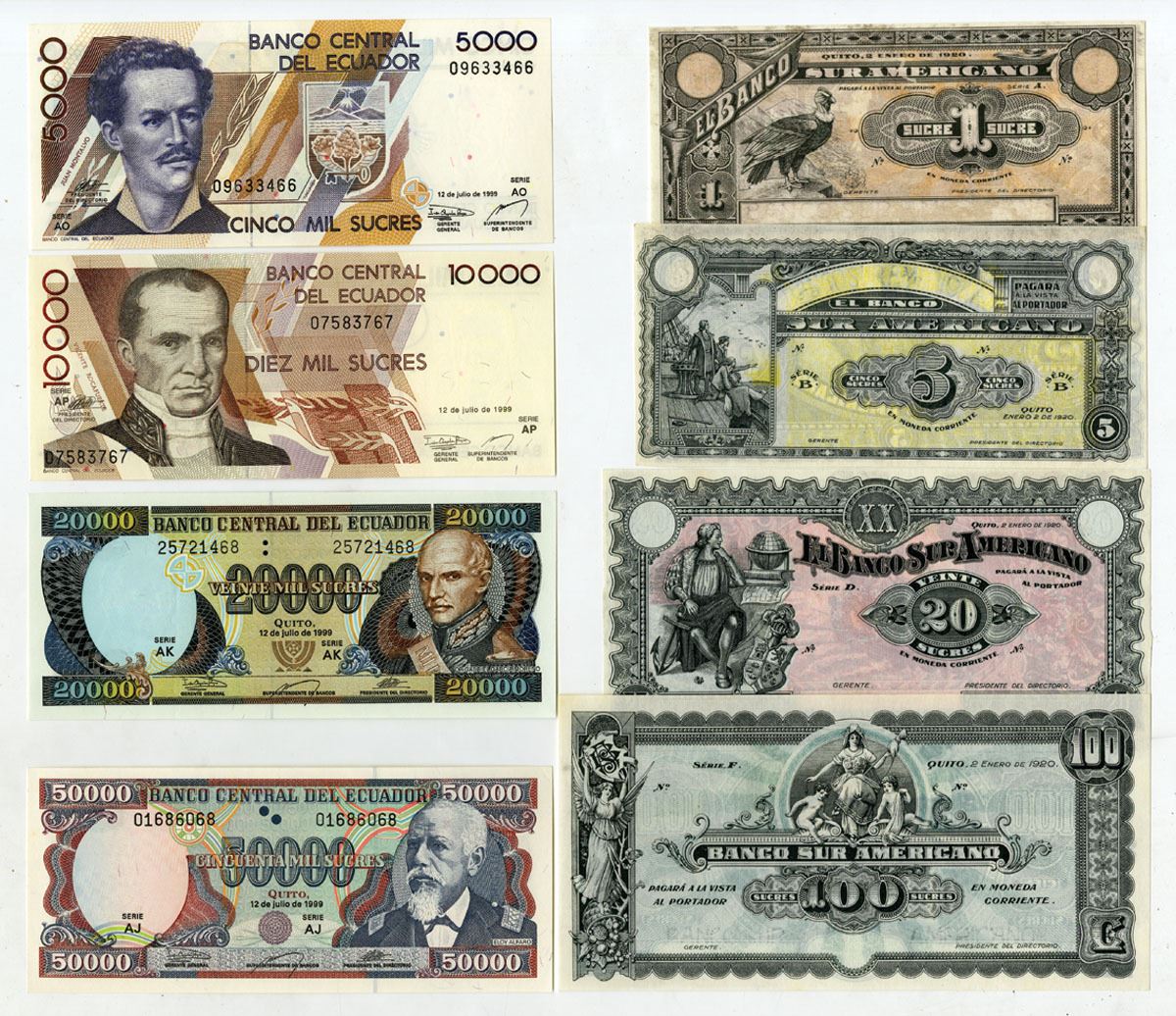 Ecuador..., 1920-99. Lot of 8 Banknotes, Includes: Banco Sur Americano 1 Sucre, P-S251r, 1920; 5 Sucres, P-S252r, 1920; 20Sucres, P-S253a, 1920; 100 Sucres, P-S254, 1920; Banco Central del Ecuador 10,000 Sucres, P-127f, 1999, BCdE; 50,000 Sucres, P-128c, 1999, BCdE; 20,000 Sucres, P-129f, 1999; and, 50,000 Sucres, P-130d. Notes range from AU to Unc condition. (8). Sold "AS IS" no returns accepted.