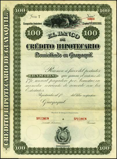 ND (ca.1900-1920). Guayaquil. 3 specimen bonds. 100, 500, 1000S Sucres. Vignette of boys with bulls. Different color borders. Coupons attached. Red specimen overprints, "0000" serial numbers and POC's. Coupons attached. Fine to XF condition. ABNC.