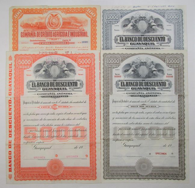 Quito & Guayaquil, Ecuador, ND (ca.1940-72). Lot of 4 Specimen Bonds, Includes: Compania de Credito Agricola e Industrial, 100 Sucres, Specimen Bond; El Banco de Descuento 5000 Sucres, Orange border; 10,000 Sucres, Brown border; 10,000 Sucres, Gray border. All pieces have Specimen overprints and POC's, and were printed by ABNC. VF-XF condition. (4). Sold "AS IS" no returns accepted.