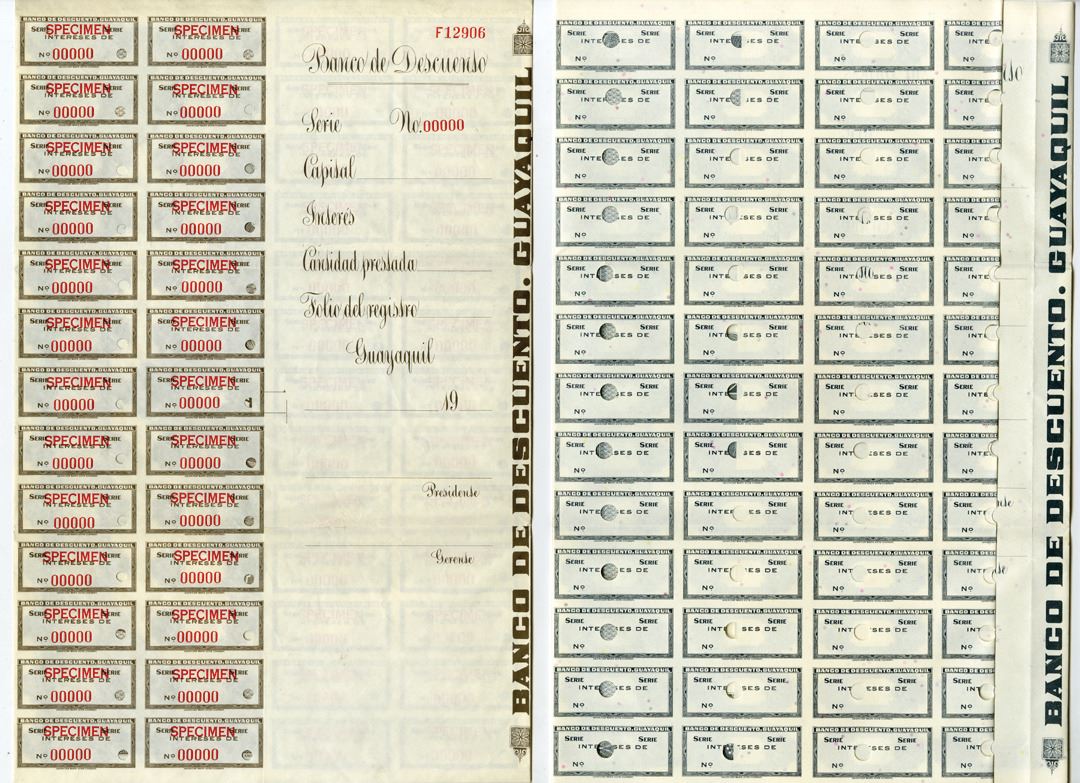 Quito & Guayaquil, Ecuador, ND (ca.1940-72). Lot of 4 Specimen Bonds, Includes: Compania de Credito Agricola e Industrial, 100 Sucres, Specimen Bond; El Banco de Descuento 5000 Sucres, Orange border; 10,000 Sucres, Brown border; 10,000 Sucres, Gray border. All pieces have Specimen overprints and POC's, and were printed by ABNC. VF-XF condition. (4). Sold "AS IS" no returns accepted.