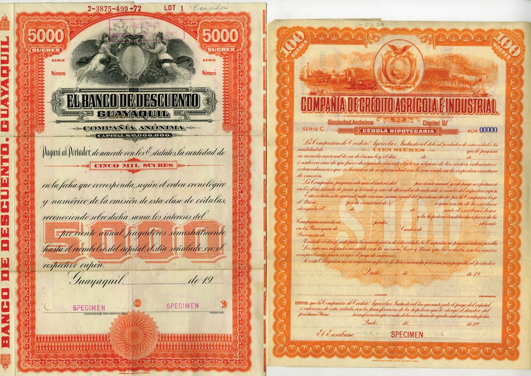 Quito & Guayaquil, Ecuador, ND (ca.1940-72). Lot of 4 Specimen Bonds, Includes: Compania de Credito Agricola e Industrial, 100 Sucres, Specimen Bond; El Banco de Descuento 5000 Sucres, Orange border; 10,000 Sucres, Brown border; 10,000 Sucres, Gray border. All pieces have Specimen overprints and POC's, and were printed by ABNC. VF-XF condition. (4). Sold "AS IS" no returns accepted.