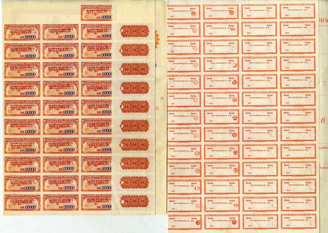 Quito & Guayaquil, Ecuador, ND (ca.1940-72). Lot of 4 Specimen Bonds, Includes: Compania de Credito Agricola e Industrial, 100 Sucres, Specimen Bond; El Banco de Descuento 5000 Sucres, Orange border; 10,000 Sucres, Brown border; 10,000 Sucres, Gray border. All pieces have Specimen overprints and POC's, and were printed by ABNC. VF-XF condition. (4). Sold "AS IS" no returns accepted.