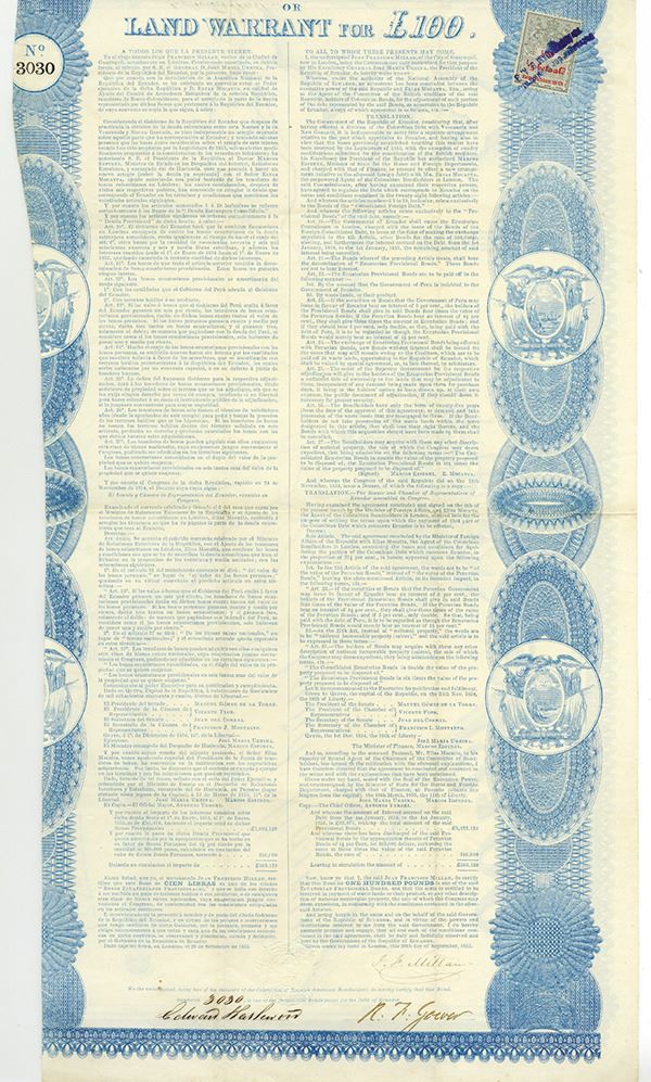 Ecuador. Ecuadorian Provisional Bond or Land Warrant for £100 Pounds, 1855. Blue. Back has large map of Ecuador. Counterfoil trimmed border, left. No. 3030. Not cancelled. VF. (John E. Herzog Collection)