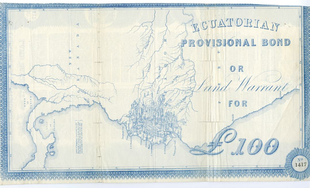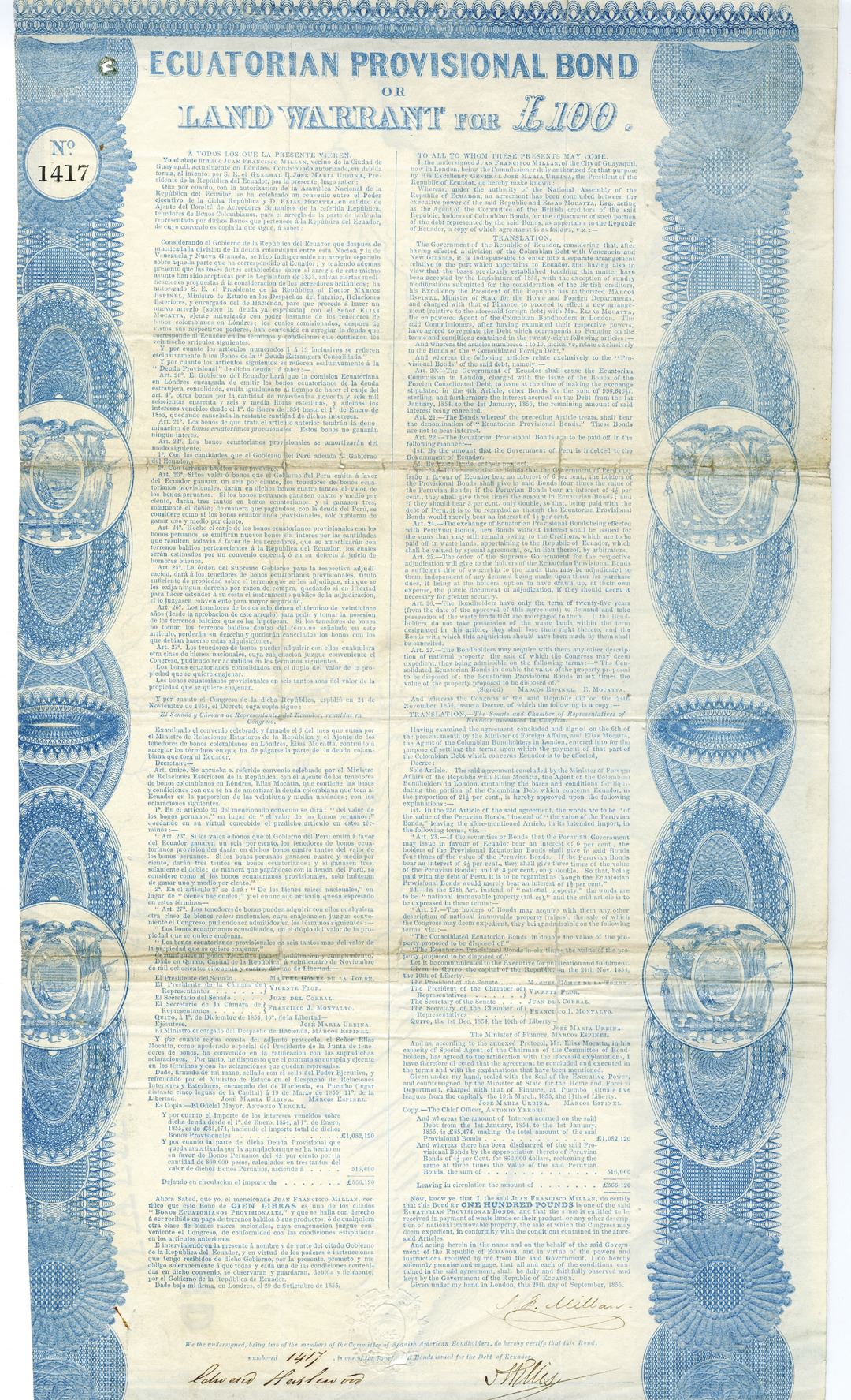 Ecuador. Ecuatorian Provisional Bond or Land Warrant for 100 Pounds, 1855. Blue. Counterfoil trimmed border, left. No.1417. Not cancelled. Minor fold stain and internal splits, otherwise VF. (John E. Herzog Collection)