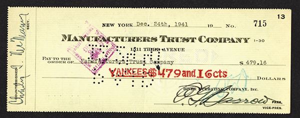 New York, December 24th, 1941, Issued and cancelled check for $479.16. Payment for Park Pay Roll, Stadium RPS, and Football purchase. Signed by Superintendent Charlie McManus on back, front with Ed Barrow's signature as Vice President. Barrow was a manager and front office executive in Major League Baseball. He served as the field manager of the Detroit Tigers and Boston Red Sox. He served as business manager (de facto general manager) of the New York Yankees from 1921 to 1939 and as team president from 1939 to 1945, and is credited with building the Yankee dynasty. Barrow was elected to the Baseball Hall of Fame in 1953.