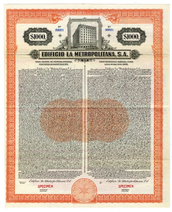 Cuba. $1,000 American Dollars Specimen 7% First Mortgage Sinking Fund Gold Coupon Bond, Black print on orange border and under tint printed in English and Spanish, Large building at top above company title, Specimen overprints and POC's, VF-XF condition, ABNC.