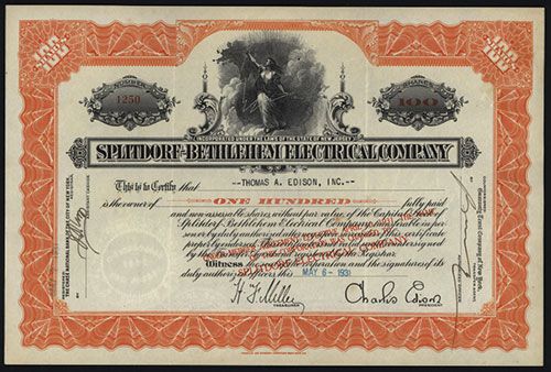 New Jersey, 1931, I/U, #1250, 100 Shares, Red overprint that reads “ Under merger agreement effective April 10, 1931, the name of this corporation was changed to Splitdorf Electrical Company” , Facsimile signature of Charles Edison, VF condition, FL-ABNC. Edison related company.