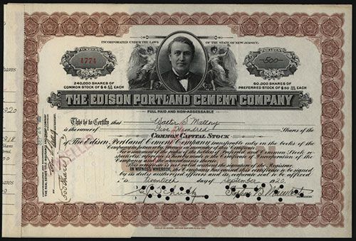 New Jersey, 1920, I/C, #1774, 500 Shares, Black on brown border and underprint, Portrait of Edison top center flanked by two allegorical women, Fine condition with POC's, FLBNC.