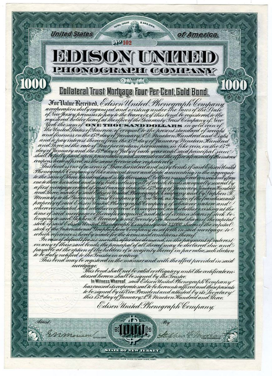 New Jersey, 1903. $1000 I/U 4% Collateral Trust Mortgage Gold Coupon Bond #102, Black text with green border and undertint. VF condition, ABNC. The Edison United Phonograph Company manufactured and marketed phonographs and graphophones.