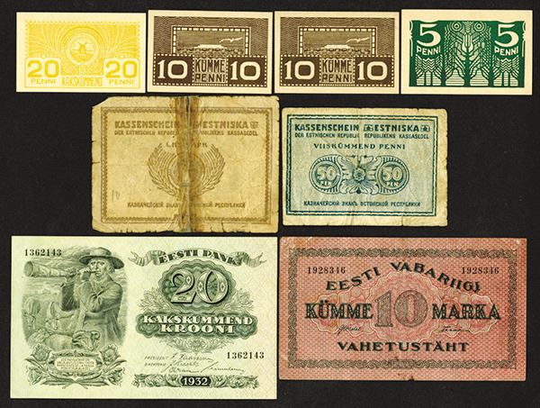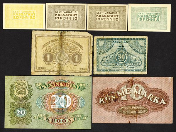 Estonia.5, 10, 20, 50 Penni; 1, 10 Marka; 20 Krooni. P-39a, 40a; 41a; 42a; 43a (Very Good, stain); 53a; 64a. First three About Uncirculated or better, others generally Fine-Very Fine except where noted.7 pieces.