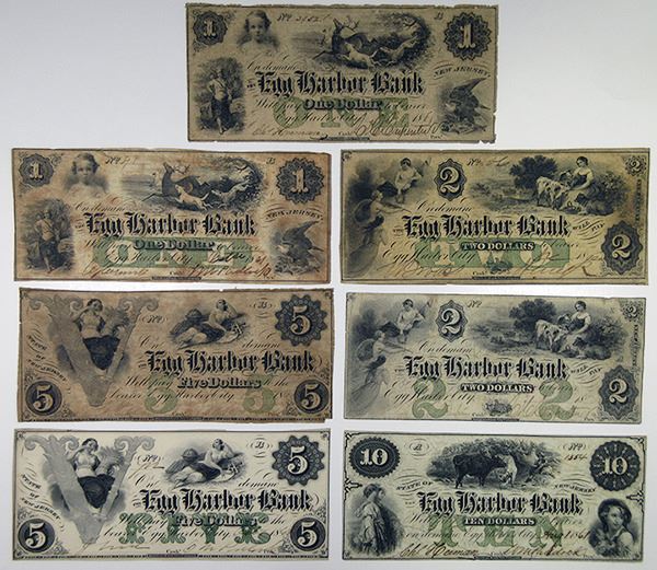 Egg Harbor City, NJ. Lot of 7 notes, Includes $1, $2, $5, & $10, 1861, Wait 515, 517, 518, 520, 521, 523, & 524, R-1, R-2, R-3, & R-4. The Egg Harbor Bank was opened in 1860 and failed in 1861. This lot contains 7 pieces, all of which have green protectors with the denomination. There are two $1 notes(Wait 515 & 517), two $2 notes(Wait 518 & 520), two $5 notes(Wait 521 & 523), and one $10 note(Wait 524). This lot contains only one R-4 note(Wait 517), with the other notes being R-1, R-2, and R-3. VG to AU condition, please inspect, no returns accepted. (7)