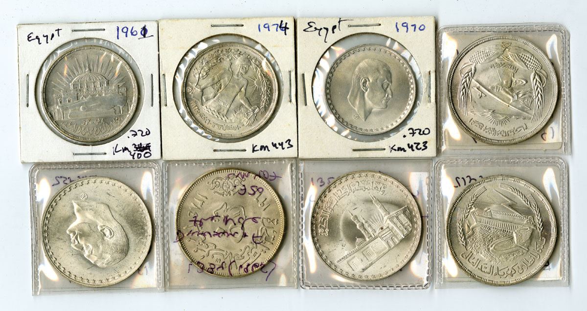 Cairo, Egypt (1960s–1970s). Egypt Silver Commemorative 1_Pound Set. A cohesive group of eight Arab Republic of Egypt silver 1_pound commemoratives from the late Nasser/early Sadat era, exhibiting strong calligraphic artistry and national motifs (education, industry, development). These large 40_mm pieces are the classic Egyptian format of the period, struck in .720 fine silver at 27_g each with reeded edges; Choice Uncirculated or better with lively luster. Total pure .999 silver equivalent for this group: __4.99 troy oz, (8 coins).