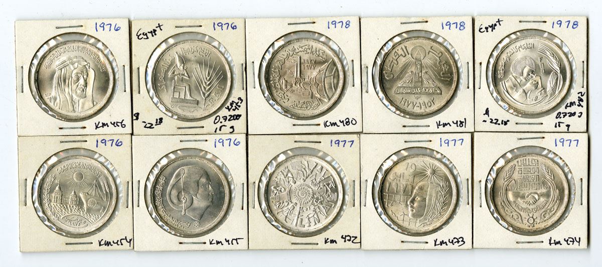 Cairo, Egypt (1976–1978). Egypt Silver 1_Pound Commemorative Series. Ten large_format Arab Republic of Egypt silver 1_pound commemoratives dated 1976–1978, covering national themes of development, education, and cultural progress; all are the standardized 4_mm .720_fine, 27_g type with reeded edges and bold Arabic legends. Uniform Choice to Gem Uncirculated surfaces and matching eye appeal across the set. Total pure .999 silver equivalent for this group: __6.24 troy oz (10 coins × 27_g × .720).