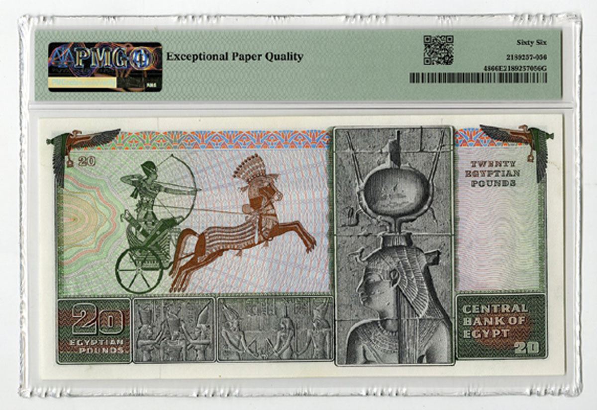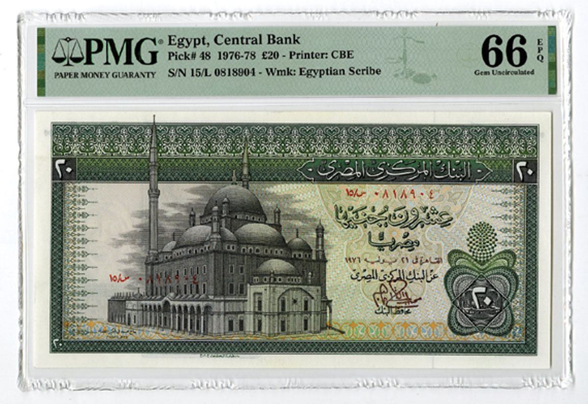 Egypt, 1976. 20 Pounds, P-48, Issued Banknote, Green and black print with m/c underprint, Mahammed Ali mosque at center, Back is green black and brown with m/c underprint, Archaic war chariot at left center with frieze at right, S/N 15/L 0181904, PMG graded Gem Uncirculated 66 EPQ.