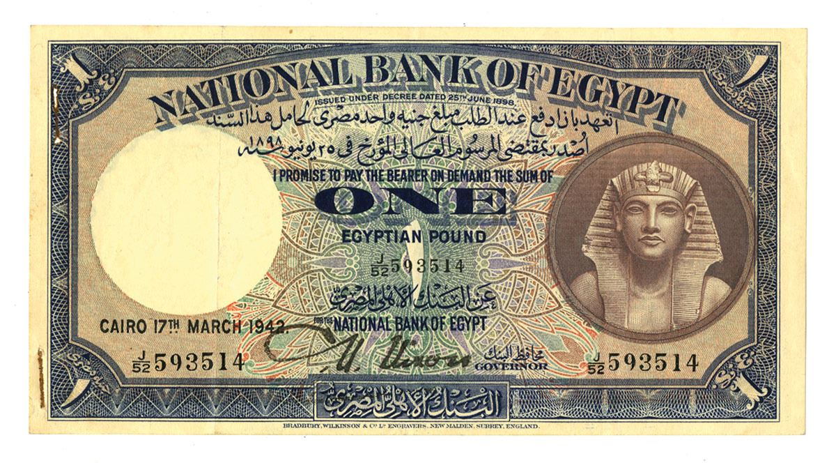 Egypt, 1942. 1 Pound, P-22c, Issued Banknote, Blue on m/c underprint, Portrait of Tutankhamen in brown at right, Back is green with Mosque at center, S/N J/52 593514, Note is in VF to XF condition with 4 small staple holes and minor rust stains at left, BWC.