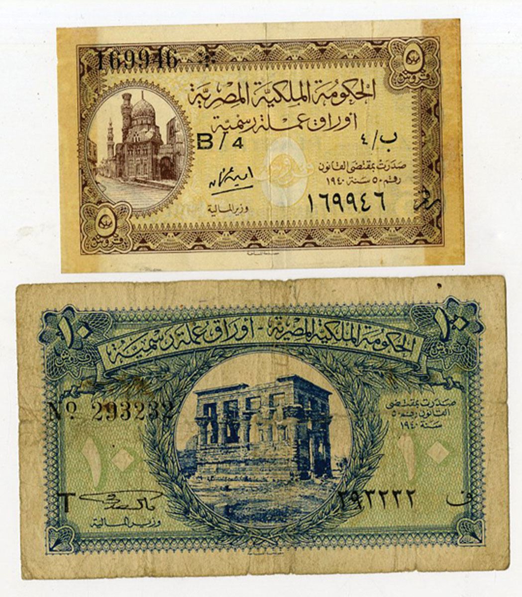 Egypt, ND (1940s). Lot of 2 Issued Banknotes, Includes: 5 Piastres, P-164, Brown on yellow underprint with Mosque of Emir Khairbak at left; 10 Piastres, P-167a, Blue on green underprint with Temple of Philae at center. Notes are in Good-Fine condition. (2). Sold "AS IS" no returns accepted.