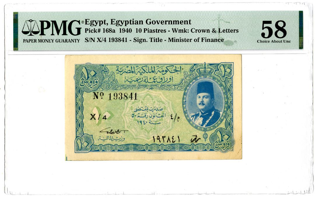 Egypt. 1940. 10 Piastres, P-168a, Issued Banknote. Blue on green underprint with portrait of King Farouk at right. S./N X/4 193841 with watermark of crown and letters. PMG graded Choice About Uncirculated 58.