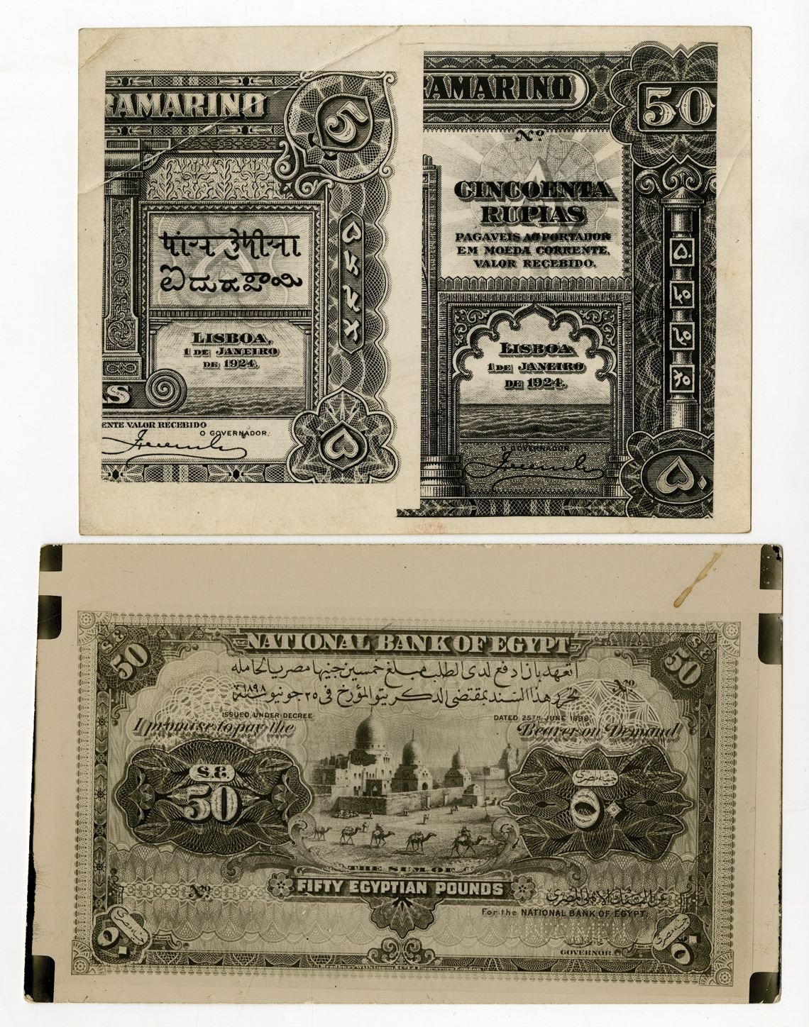 Egypt & Portuguese India, 1913-24. Lot of 2 Obverse Photo Proofs: ND (L.of 1899), National Bank of Egypt, 50 Pounds, BWC; and, 1924, Portuguese India, Banco Nacional Ultramarino 5 Rupas and 50 Rupas right side of notes on same Obverse Proof, 1924, TDLR. Both obverse proofs are black and white and printed on glossy paper. (2). Sold "AS IS" no returns accepted. Printed on photo paper. The photo proofs of the original notes were used during the production process for comparison of designs and text and for reference. Original photo-proofs from the Thomas De La Rue production and design department.