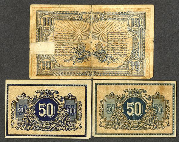 Russia - North Caucasus. 50 Kopeks, 10 Rubles. SCWPM S494A (2), S495a. First two are Fine-Very Fine, the last is Good with some edge tears, repairs and dirt. 3 pieces.