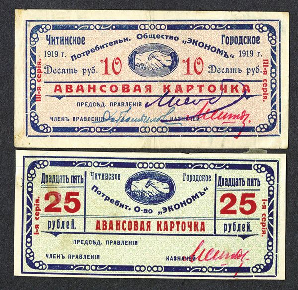 Chita, Russia, Lot of 2 notes, Includes 10 Rubles, Issued, AU and 25 Rubles, partially issued, and Uncirculated with stamp hinge remnants from mounting, Black on light orange or light green with hands shaking in middle, Attractive scrip notes. (The Pogrebetsky Family Archives)