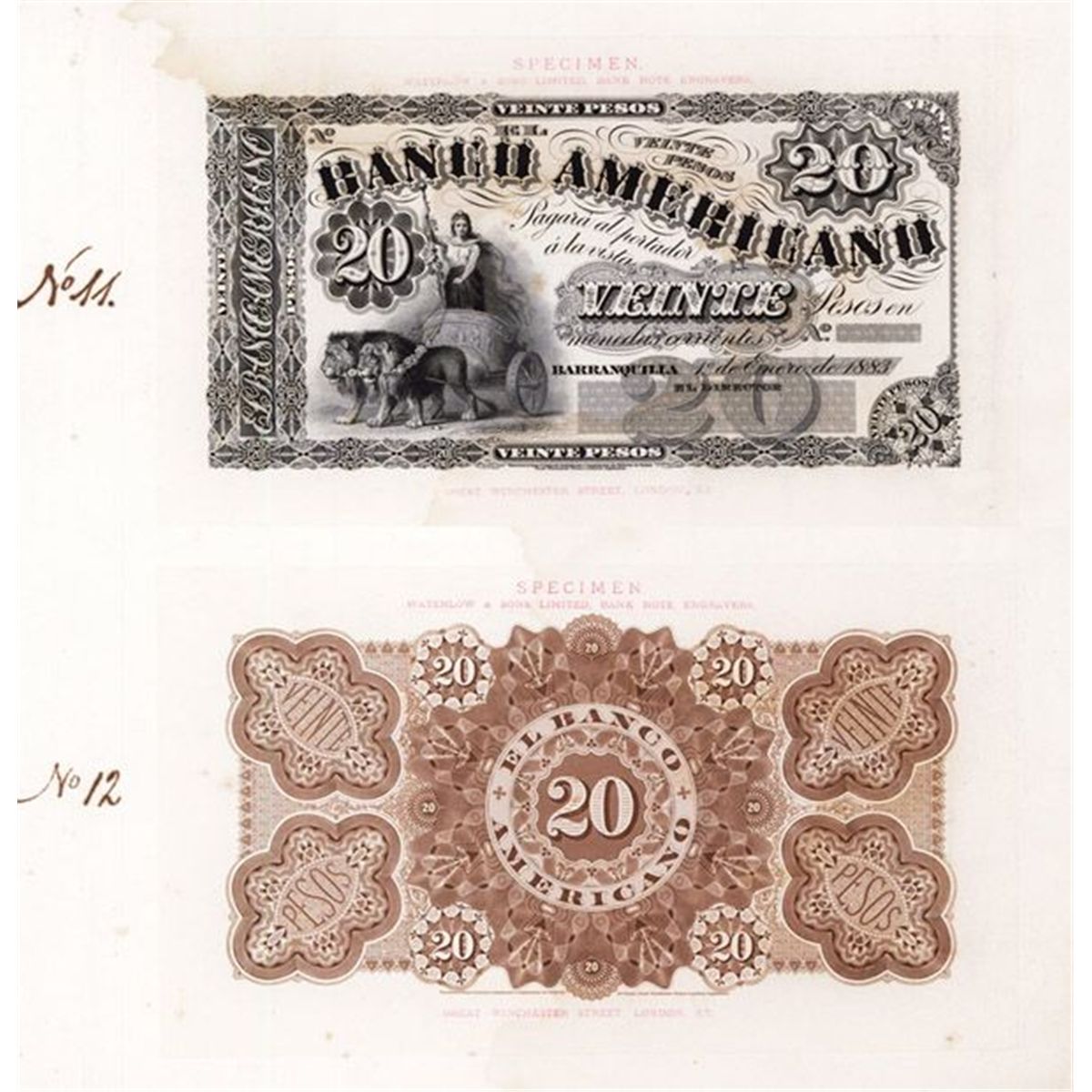 Barranquilla, Colombia, 1 January 1883, El Banco Americano, 20 Pesos, P-Unlisted denomination but evidently from the same 1883 series as the 50 Centavos, P-S211, also by Waterlow, Black with no underprint, Allegorical Liberty in chariot pulled by Lions on left with ornate text and title with underprint “20”, Waterlow & Sons Ltd. die proof on India paper on card, with the back also proof on India paper on card in avocado green. This note was presented in a presentation album in the mid-1880's by Waterlow & Sons Ltd., Great Winchester St. London EC. Some pages of this believed unique album have been removed. The face is number 11 from this album, the back number 12. Light foxing and water stains are visible on the cards but they would grade Uncirculated condition otherwise, Extremely rare and possible discovery notes from this amazing issue. W&S.