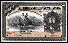 Guatemala. 1895. 100 Pesos. Series D. P-S114s. Specimen with POC's. Allegorical women "Agriculture" and "Commerce" on front. Small archival notation in red in middle of note "Order dated 1895". XF+ to AU condition with 2 small staple hole near left border. Scarce and attractive large size note. ABNC.