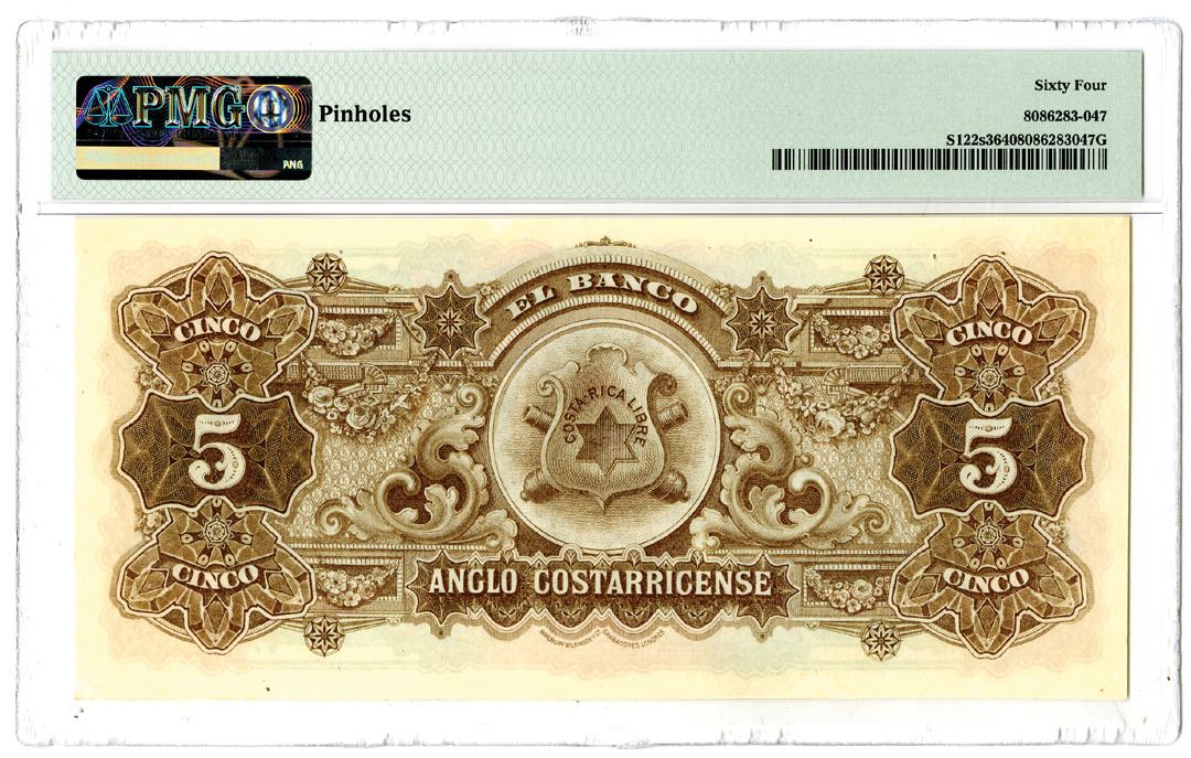Costa Rica. ND; 1903-17. 5 Colones, P-122s3, Specimen banknote, Black on multicolor underprint, S/N A 116593 - Red Ovpt. - Type C, PMG graded Choice Uncirculated 64 with comment "Pinholes". Printer: BWC.