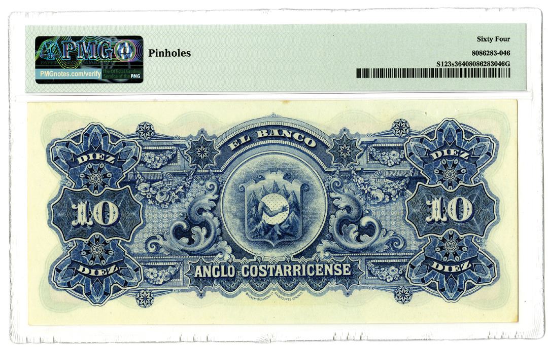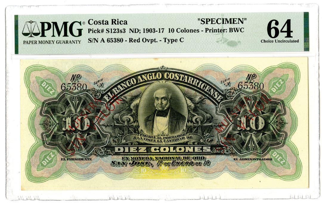 Costa Rica. ND; 1903-17. 10 Colones, P-S123s3, Specimen banknote, Black on multicolor underprint, S/N A 65380 - Red Ovpt. - Type C., PMG graded Choice Uncirculated 64 with comment "Pinholes". Printer: BWC.