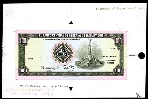 San Salvador. March 17, 1988, 100 Colones, No Series, P-137s2, Proof or uniface specimen face printed on security banknote paper with large margins and guide holes. Dated 9/9/88 on plate. Choice to Gem uncirculated. ABNC. Rare production specimen.