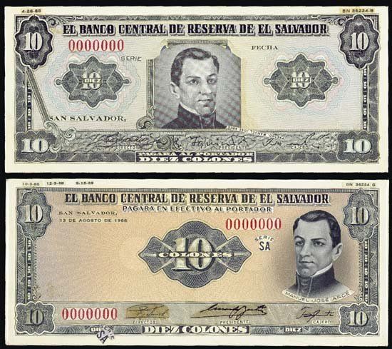Unique Production Proofs For 1968 to 1970 issue. 1968-70. P-110a Unlisted, 1 Colon uniface proof; P-111a Unlisted, 5 Colones, face and back uniface proofs cut down to en banknotes that deservef bank note size with approval stamps and signatures on back; P-110a Unlisted Specimen, 5 Colones, red "Muestra Sin Valor" overprints and an additional uniface approval back proof in issued color with archival notations; P-112 Face Essay Model Designwith vignette in middle rather than right side; P-112 Final Design Models of face and back of issued design. All 3 of the models are unique face and back models are unique. USBNC. Interesting assortment of proof, essay and specimens.