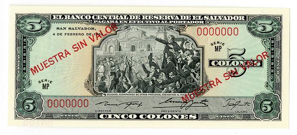 El Salvador, specimen 5 Colones, 1969, P-111a, overprinted "MUESTRA SIN VALOR", s/n 0000000, Gem Uncirculated. USBC.