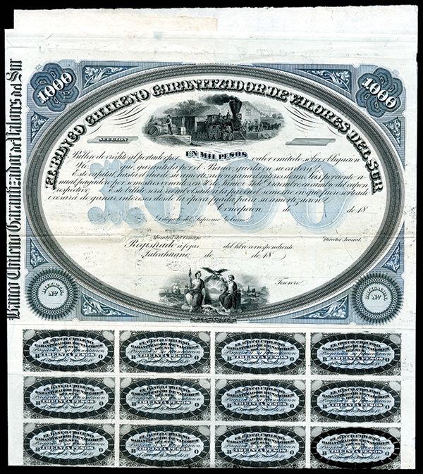 El Banco Chileno Garantizador De Valores Del Sur, 1870's Unique Approval Proof Bond. Chile, ca.1875, Specimen Bond certificate issued by NBNC, Printed on india paper, RARE, VF Condition, Splits, I/U