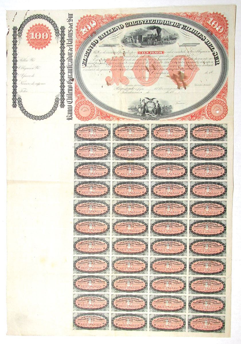 Concepcion, Chile, ND (1860s). 100 Pesos Specimen 7% Coupon Bond, Black on red border and underprint, Locomotive at station at top being loaded with barrels, POCs, Fine to VF condition with ink stains. NBNC.