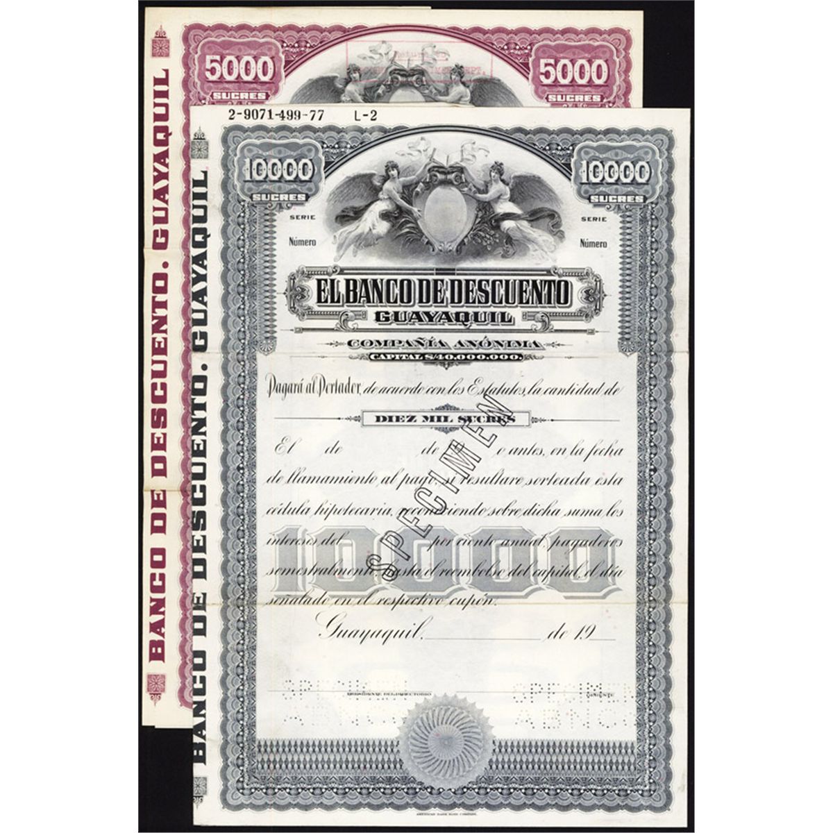 Guayquil, 19xx (ca. 1900-1920), Lot of 2 bonds, Includes 5000 Sucres, Purple and 10,000 Sucres, grey-green, Both with allegorical angels flanking blank oval on top, coupons, Specimen, POC's, VF condition. ABNC.