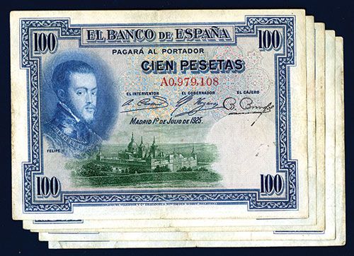 Madrid, Spain. 1925, Lot of 5 notes, all are 100 Pesetas, P-69a, Issued notes between Choice Fine to VF condition. BWC.