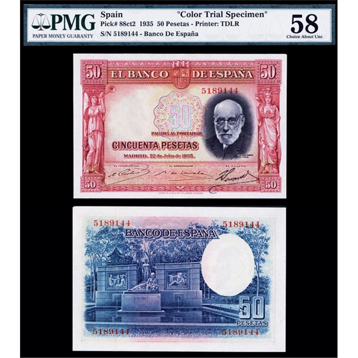 Madrid, Spain, 22nd July, 1935, 50 Pesetas, P-88ct2, unlisted color trial, Black on red and m/c instead of issued purple on m/c, Portrait of Cajal on right, S/N 5189444, PMG graded Choice About Unc. 58, Attractive note with large and even margins and bright colors. TDLR.