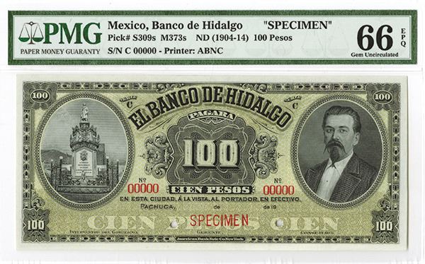 Pachuca, Mexico, 100 Pesos. P-S309s, M373s, Specimen banknote. PMG graded Gem Uncirculated 66 EPQ, Red specimen overprint, "00000" serial numbers and POC's. Scarce Banknote. ABNC. Scarce note and rarely seen in high grade.