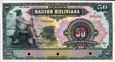 Bolivia. 1911, (ca.1929); Ser.A. P-116 Essay Unlisted. 50 Bolivianos Specimen banknote from 1911 Regular Issue Series for "El Banco De La Nacion Boliviana" that was used as the base note for the 1929 Provisional Issue for "Banco Central De Bolivia". The m/c guilloches (cycloid tints) are a different shape for P-116 than the ones used on the 1911 issue, P-110 and there are 2 areas where "Serie A" is located on P-116, on the lower right and the upper left and only one on P-110, at the lower right only. I suspect that these notes were printed directly for this provisional issue and were not remainders left over from the previous printing. It is possible that the notes were printed without overprints, undertints and cycloid tints and serial numbers in 1911 and were held in storage until 1929, and, when needed, the new undertints and cycloid tints could have been added later. Deserves further research. Red "Specimen" overprints, POC's and "00000" serial numbers. Unlisted as a specimen in SCWPM as well as unlisted without overprint of "Banco Central De Bolivia". Choice uncirculated condition. Scarce note. ABNC.