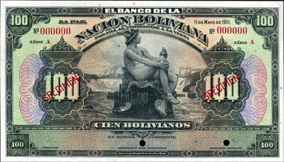 Bolivia. 1911, (ca.1929); Ser.A. P-117 Essay Unlisted. 100 Bolivianos Specimen banknote from 1911 Regular Issue Series for "El Banco De La Nacion Boliviana" that was used as the base note for the 1929 Provisional Issue for "Banco Central De Bolivia". The m/c guilloches (cycloid tints) are a different shape for P-117 than the ones used on the 1911 issue, P-111. I suspect that these notes were printed directly for this provisional issue and were not remainders left over from the previous printing. It is possible that the notes were printed without overprints, undertints and cycloid tints and serial numbers in 1911 and were held in storage until 1929, and, when needed, the new undertints and cycloid tints could have been added later. Deserves further research. Red "Specimen" overprints, POC's and "00000" serial numbers. Unlisted as a specimen in SCWPM as well as unlisted without overprint of "Banco Central De Bolivia". Choice uncirculated condition. Scarce note. ABNC.
